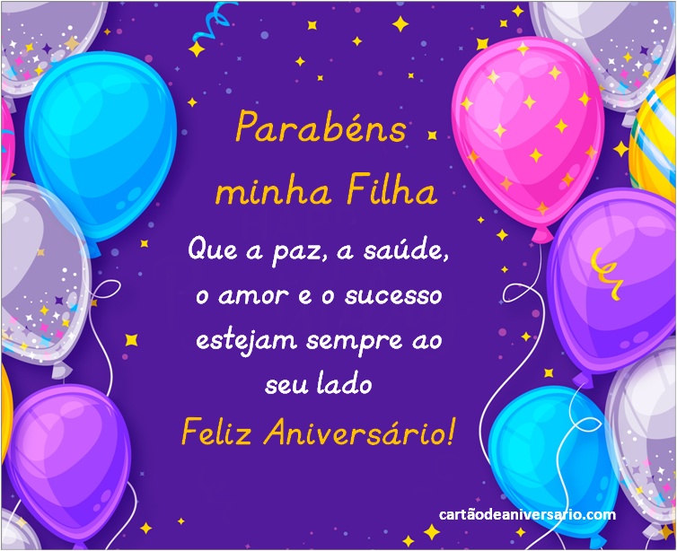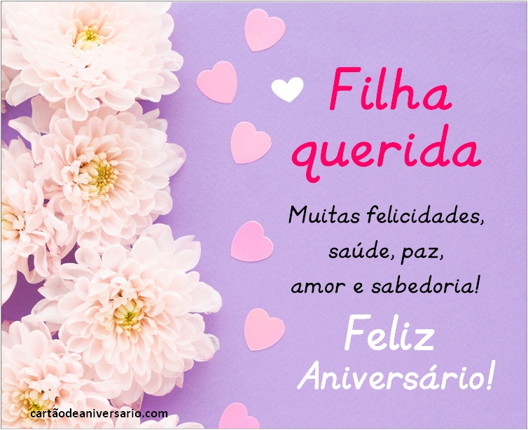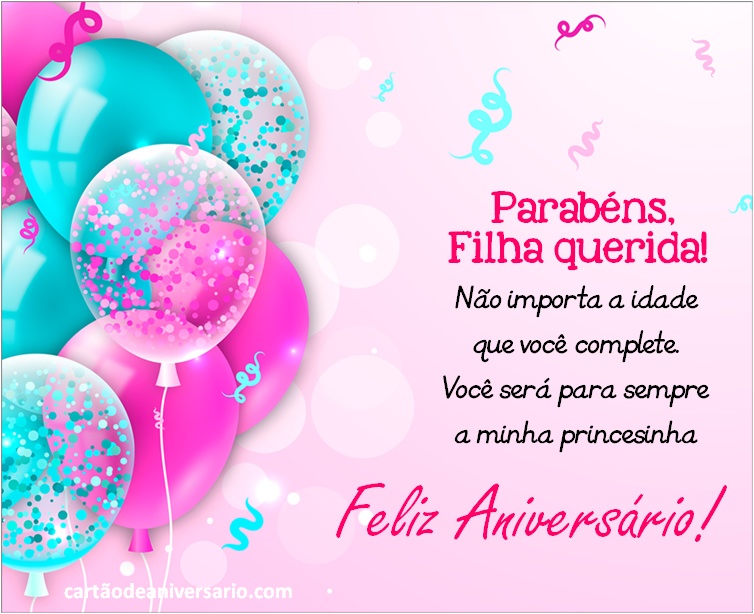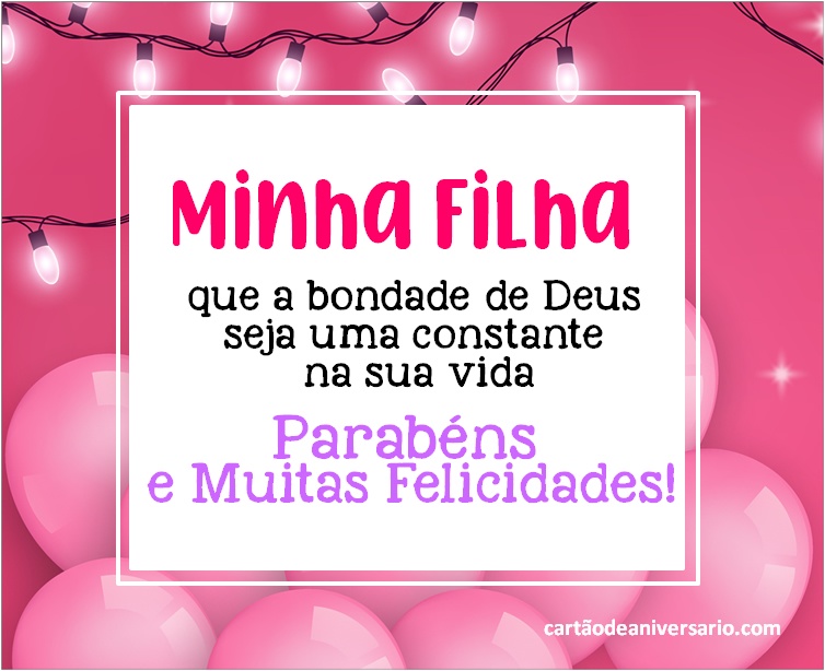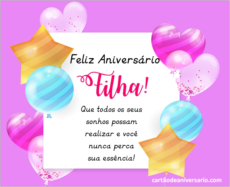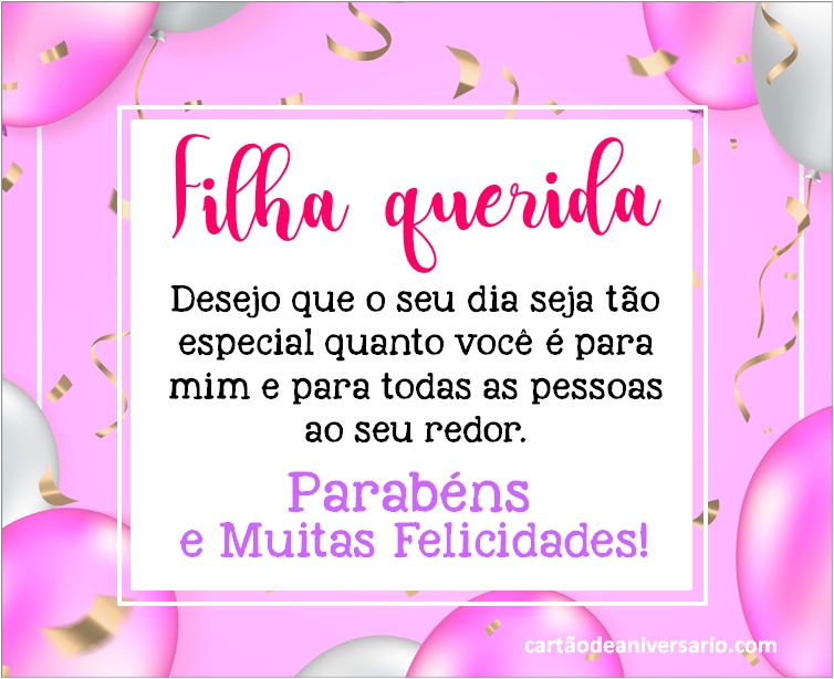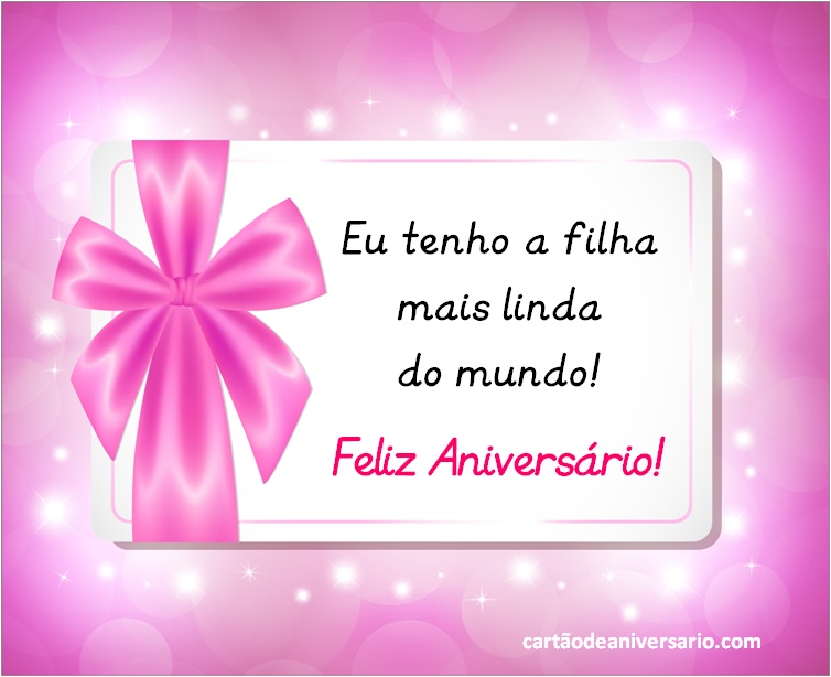 Lindos cartões virtuais para comemorar aniversário de uma filha, criativos, originais e variados totalmente gratuitos. Enviar lindos textos de aniversário é uma excelente ideia para expressar nossos desejos por aquela pessoa especial. Escolha sua frase favorita de feliz aniversário. Os cartões de aniversário para filha que podem ser publicados nas redes sociais representam uma das melhores formas de demonstrar todo o amor que sente pela princesa da casa. Agora você terá a oportunidade de enviar um lindo cartão de aniversário para filha acompanhado de lindas mensagens