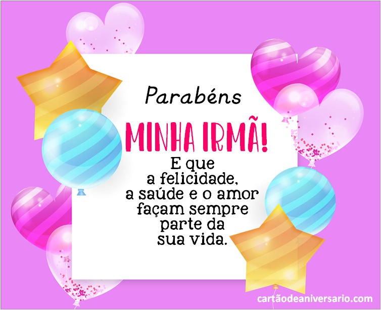 Envie sua saudação à sua irmã de forma original. Pesquise entre as nossas belas imagens de feliz aniversário com frases especiais. Os postais de feliz aniversário da sua irmã podem baixar gratuitamente e são perfeitos para serem enviados por qualquer rede social (whatsapp, facebook, instagram). Quando nossa irmã está longe de nós, enviamos nossos parabéns por meio de cartas, SMS, e-mails ou redes sociais. feliz aniversário irmã cumprimentá-la com todo amor e carinho do mundo é uma boa ideia.