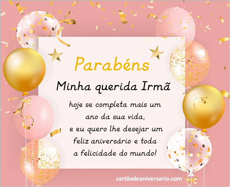 Feliz aniversário é uma data especial e maravilhosa para compartilhar com a família. Imagens de parabéns originais para dedicar à sua querida irmã. Temos a certeza que estes postais de feliz aniversário para dedicar a uma querida irmã serão do seu agrado, escolha o seu favorito e envie-o por Whatsapp ou nas redes sociais. Um aniversário será sempre motivo de felicidade. Um aniversário, repetimos, é uma oportunidade de se alegrar ao passar bons momentos com amigos e familiares, sentir-se amado e contente, comer comidas deliciosas e receber presentes.