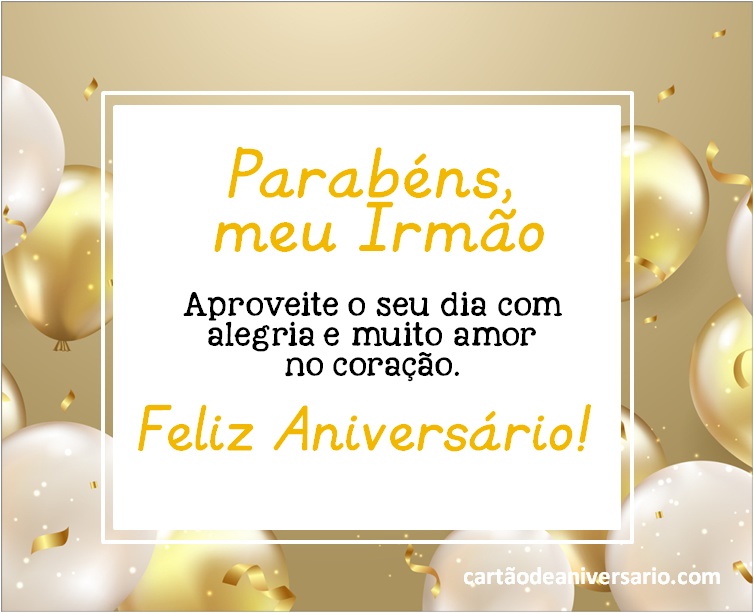 Quer dar um cartão exclusivo para o seu irmão no aniversário dele? Em cartãodeaniversario.com você pode encontrar as frases de aniversário perfeitas para seu irmão enviar e compartilhar do seu celular. Nós o ajudamos a expressar tudo o que você sente por um irmão tão amado em seu feliz aniversário. Um aniversário é um momento maravilhoso e ideal para dizer ao seu irmão o quanto você o ama e mostrar a ele sua admiração e respeito. Surpreenda-o e deixe-o muito feliz com este gesto! Atreva-se, escolha o seu postal preferido, e dê aquele belo presente!