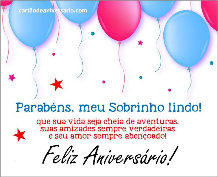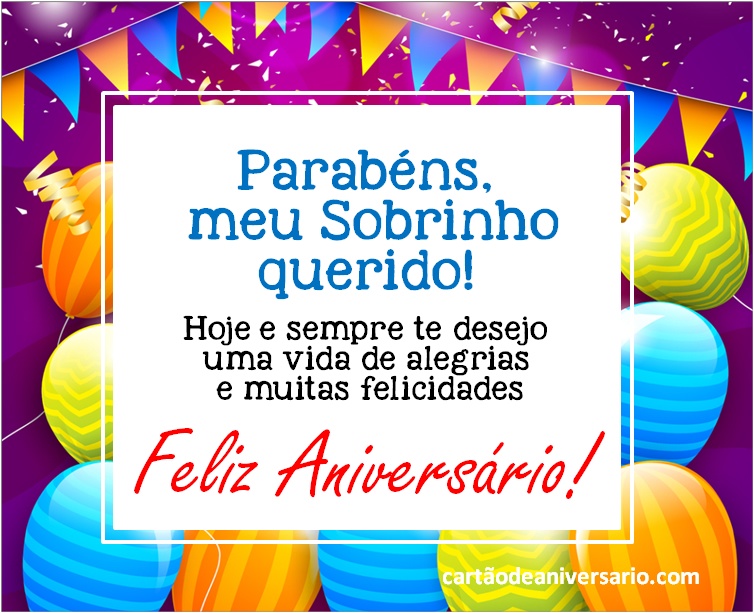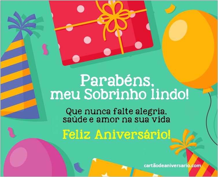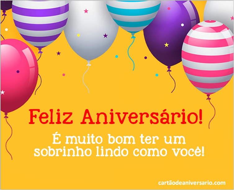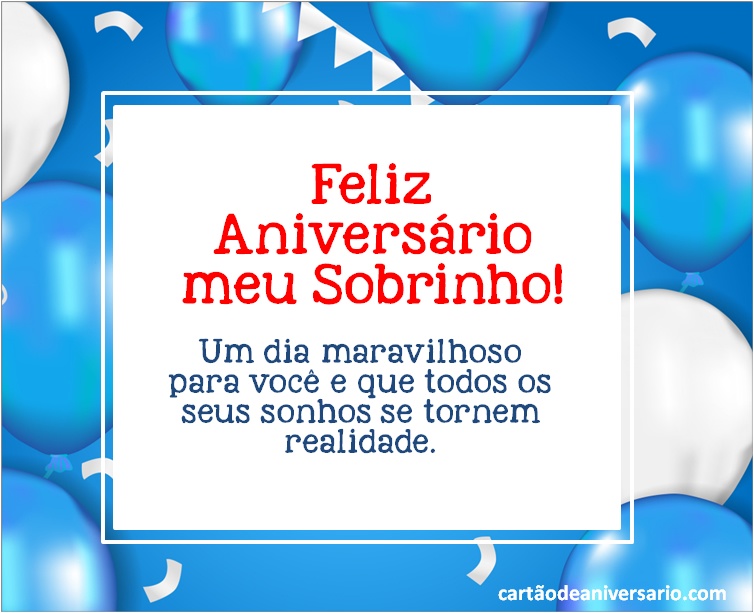 Se o aniversário do seu sobrinho está chegando, é hora de preparar uma grande surpresa para ele. Você quer enviar uma linda mensagem de aniversário para seu sobrinho? A melhor forma de dizer parabéns a um Sobrinho é através dos nossos cartões de aniversário, não perca mais tempo e parabenize o seu querido Sobrinho. Basta selecionar o cartão de aniversário que mais gosta e enviar online através de qualquer rede social e o melhor de tudo, são gratuitos. Cartões de sobrinho, envie um cartão para seus sobrinhos em qualquer época do ano e em datas especiais.
