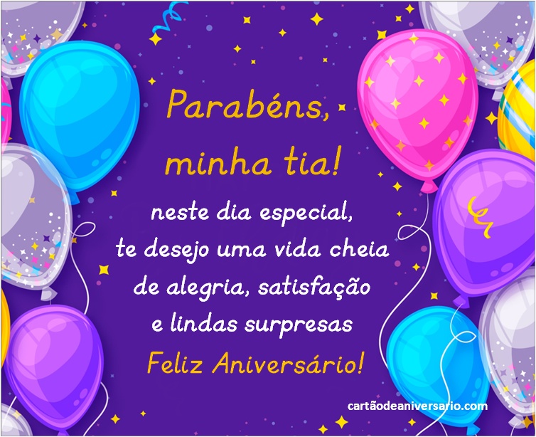 5 Parabéns, minha tia! neste dia especial, te desejo uma vida cheia de alegria, satisfação e lindas surpresas. Feliz Aniversário!